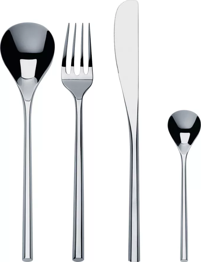 De Mu bestekset van Alessi is ontworpen door Toyo Ito. De set is 24-delig en bestaat dus uit zes lepels, zes vorken, zes messen en zes koffielepeltjes. De set is gemaakt van roestvaststaal en is vaatwasser bestendig.