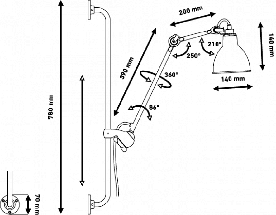 De Lampe Gras N210 wandlamp van DCW éditions heeft een ronde kap met een diameter van 14 centimeter en een hoogte van 17,5 centimeter. Het stalen armatuur is zwart met een satijnen finish en voor de kappen kan gekozen worden uit de volgende 5 kleuren: zwart, rood, geel, koper en zwart buiten/koper binnen. De lamp wordt geleverd exclusief lichtbron, de fitting is een kleine (E14) fitting. De lengte van de lange arm is 49 centimeter en die van de korte arm is 20 centimeter. De lengte van de ophangstang is 78 centimeter. De twee wandbevestigingen boven en onder aan de stang hebben een diameter van 7 centimeter. De kabel is 210 centimeter lang en de schakelaar zit op de kabel. Deze lamp weegt 3 kilo.