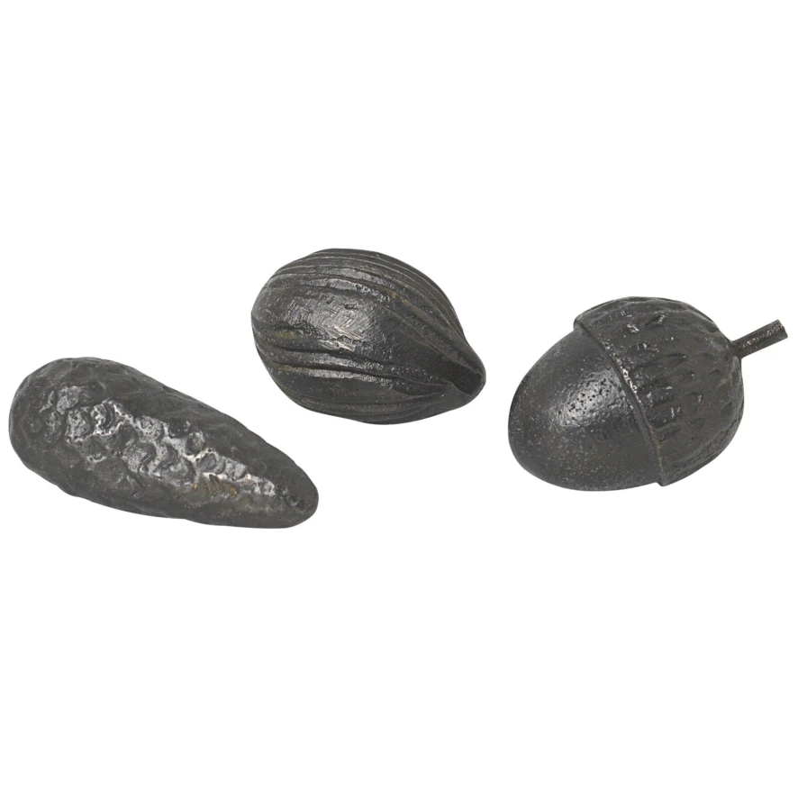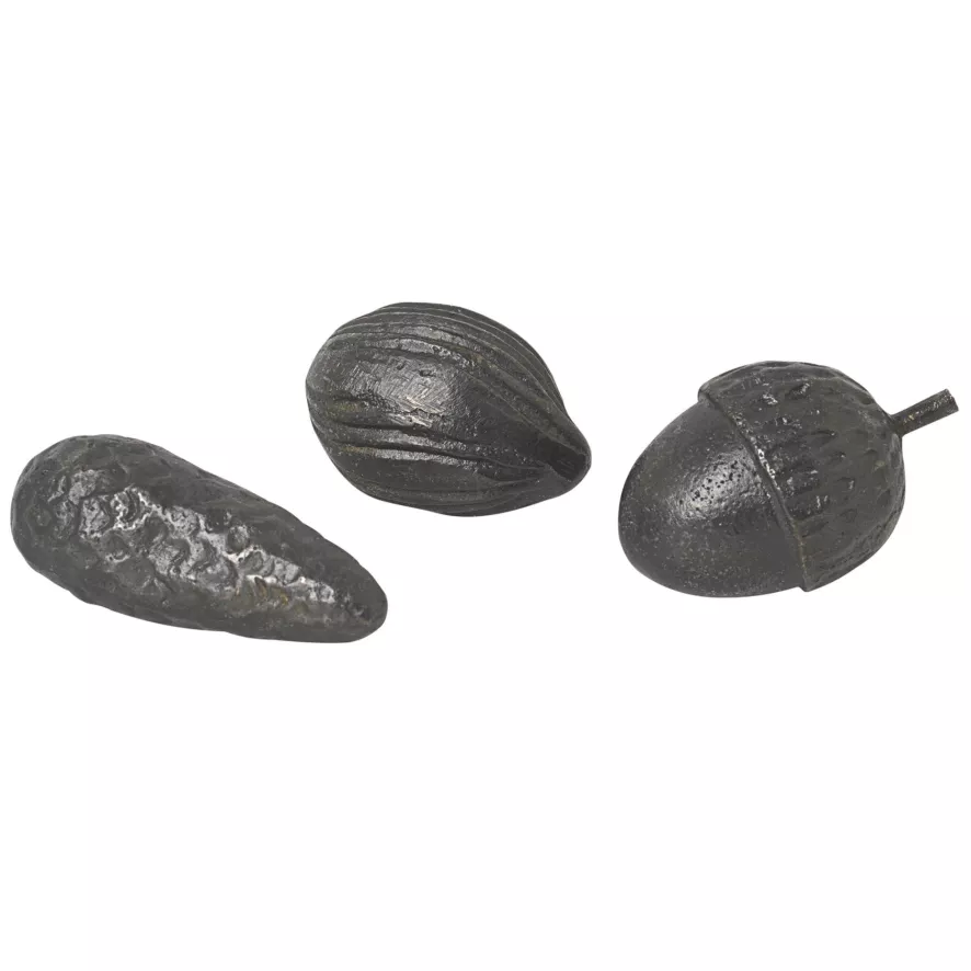 De Winterland Forest Treats woondecoratie van Ferm Living zijn koperen replica’s van eikels, dennenappels en walnoten. De decoratiestukken zijn 2,7 centimeter lang, 0,7 centimeter diep en 4,8 centimeter hoog. De woondecoratie is gemaakt van massief messing en zijn zwart van kleur. Messing is een natuurlijk materiaal dat na verloop van tijd zal patineren. Wij adviseren het decoratiestuk indien nodig te poetsen. Gebruik hierbij geen schurend oppervlak of chemicaliën.