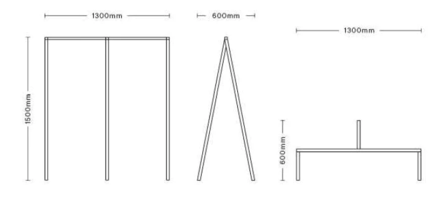 De Hay Loop Stand Wardrobe kapstok heeft een hoogte van 150 centimeter, een breedte van 130 centimeter en een diepte van 60 centimeter. Het vierkante frame is 30 millimeter dik, zulke stevigheid gecombineerd met de breedte betekent dat je er veel jassen op kwijt kan. De kapstok is gemaakt van gepoedercoat staal en is te koop in de kleuren wit en zwart. De Hay Loop Stand kapstok is ook verkrijgbaar in een variant speciaal voor in de hal.