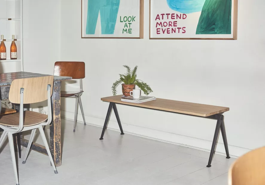 De zitting van de Pyramid 11 eetbank 85×40 van HAY is gemaakt van massief eiken en heeft een dikte van 2,1 centimeter. Het frame is van plaatstaal met een poedercoat. Er zijn meerdere uitvoeringen mogelijk: de zitting kan met een transparante of een matte lak óf in een geoliede variant van gerookt eiken geleverd worden. Het frame is verkrijgbaar met een beige of een zwarte poedercoat. Deze bank heeft een breedte van 85 centimeter, een diepte van 40 centimeter en een hoogte van 46 centimeter.