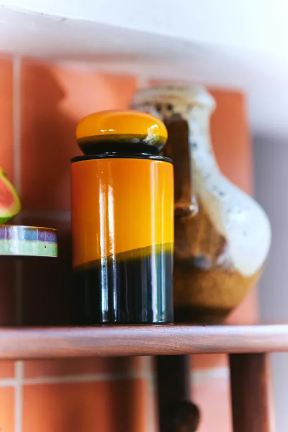 De 70’s Ceramic voorraadpot van HKliving is gemaakt van keramiek en bevat een siliconen ring voor een veilige afsluiting. De voorraadpot heeft een diameter van 11 centimeter en een hoogte van 22,5 centimeter. De inhoud van de voorraadpot is 1000 ml. De 70’s Ceramic voorraadpot weegt 1120 gram. De potten zijn vaatwasser- en voedselbestendig, maar niet geschikt voor de magnetron.