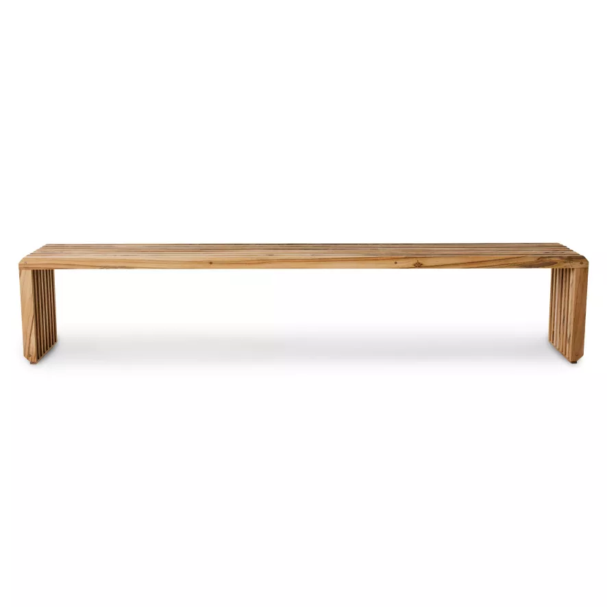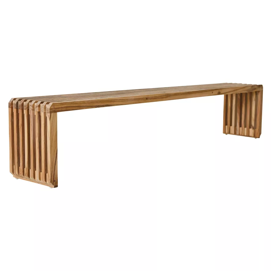 De Slatted eetbank teak van HKliving is 160 centimeter lang, 43 centimeter diep en 45 centimeter hoog. De zithoogte bedraagt 45 centimeter, de zitdiepte 43 centimeter en de zitbreedte 160 centimeter. Slatted wordt gemaakt teakhout en weegt 14,2 kilogram. De maximale gewichtsbelasting is 160 kilogram. Tussen jouw Slatted en dit voorbeeld kunnen kleine verschillen zitten. Daarnaast raadt HKliving af Slatted buitenshuis te plaatsen.