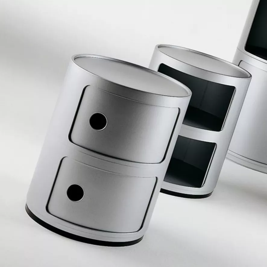 De Kartell Componibili kast heeft een diameter van 32 centimeter en een hoogte van 40 centimeter. De kast is gemaakt van de kunststof ABS. Dat is een lichte en harde kunststof met een lange levensduur. De kast is verkrijgbaar in de kleuren wit, zwart, rood en zilver. In de kast zijn twee vakken met schuifdeuren. Let op: deze variant van de kast kan niet gecombineerd worden met de Componibili wieltjes en is niet stapelbaar.