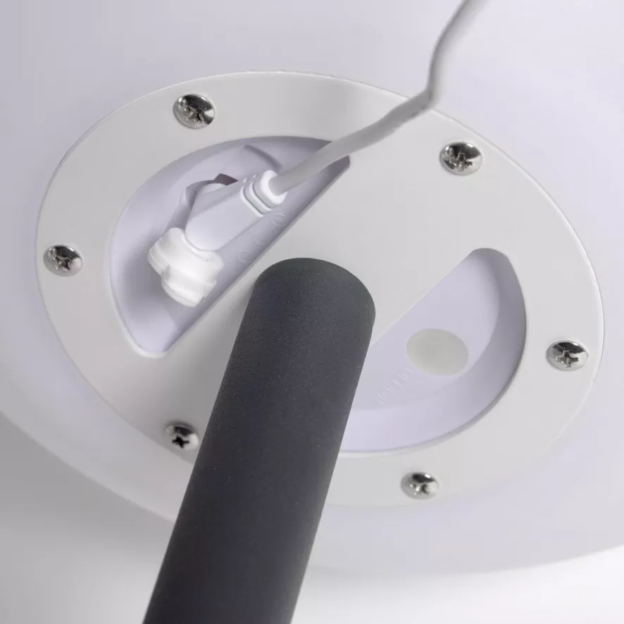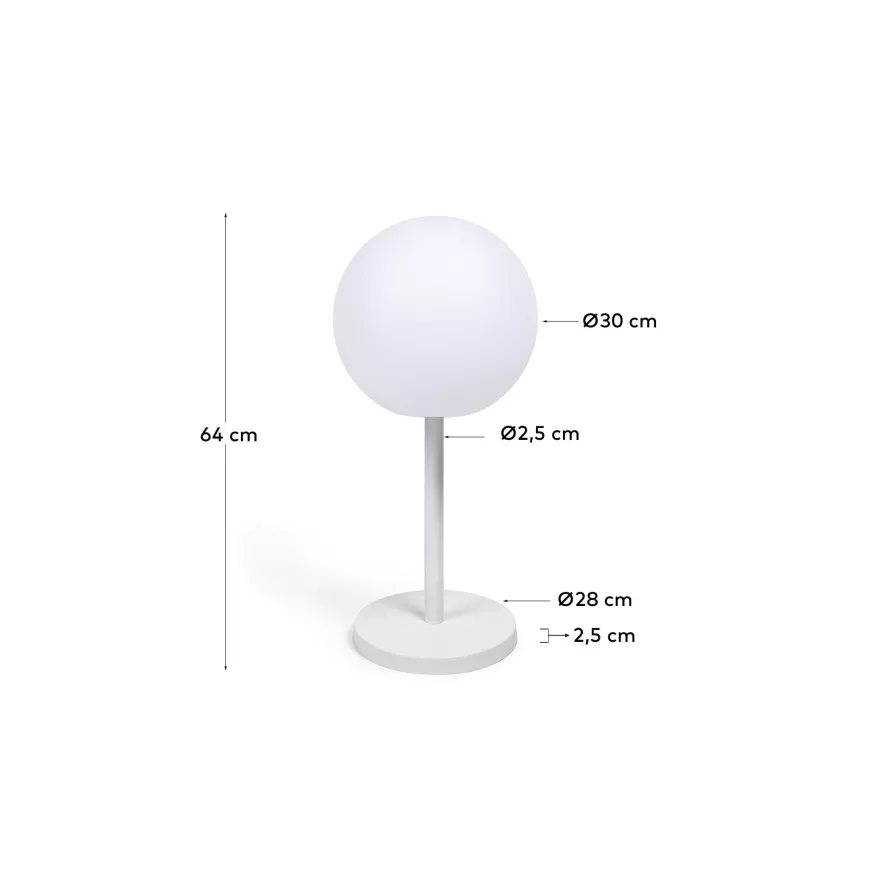 De Dinesh tafellamp oplaadbaar van Kave Home heeft een lampenkap met een diameter van 30 centimeter, een voetstuk met een diameter van 28 centimeter en de totale hoogte van de lamp is 64 centimeter. De lamp weegt 3,3 kilogram en heeft een kabel van 300 centimeter. De kabel is bekleed met kunststof, de lampenkap is gemaakt van polyethyleen en de basis is gemaakt van staal. De tafellamp is oplaadbaar en heeft dan ook een USB aansluiting om de batterij op te laden. De lamp heeft een dimbare schakelaar. De lamp bevat een ingebouwde LED-lamp met een maximale wattage van 5. De lichttemperatuur is 6000 Kelvin en de lichtsterkte is 300 lumen. De ingebouwde LED-lamp heeft een levensduur van 15.000 uur. De tafellamp is in verschillende kleuren verkrijgbaar en is geschikt voor zowel binnen als buitengebruik.