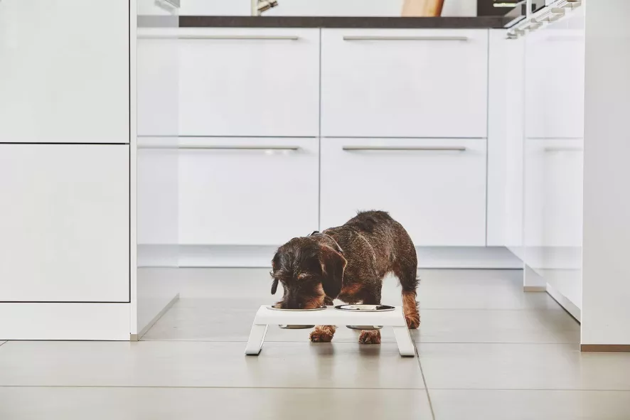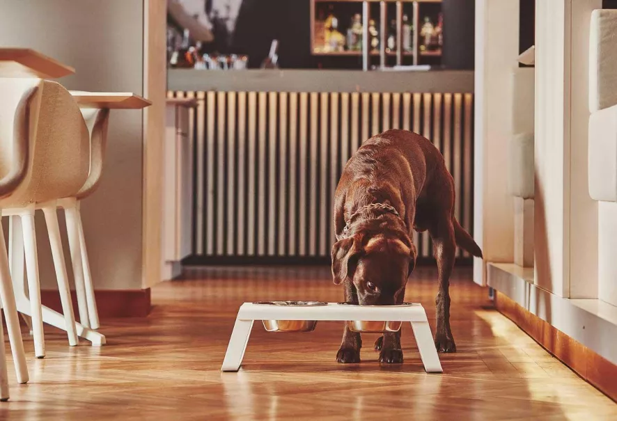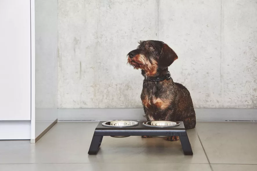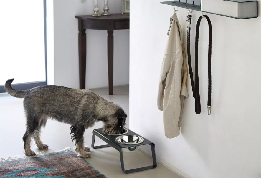 De Desco hondenvoerbak van MiaCara is een ontwerp van Mathias De Ferm. De Desco hondenvoerbak large is 78 centimeter lang, 34 centimeter breed en 24 centimeter hoog. Door siliconen aan de onderkant verschuift de bak niet maar blijft hij altijd op zijn plek. Het frame van het ontwerp is verkrijgbaar in twee verschillende materialen: multiplex of aluminium. Het aluminium is gepoedercoat in verschillende kleuren. Bij de multiplex versie heb je keuze uit walnoot of essenhout, in verschillende coatings. De bakken zijn van roestvrijstaal en hebben een inhoud van 3 liter en een diameter van 26 centimeter en kunnen gewoon in de vaatwasser.