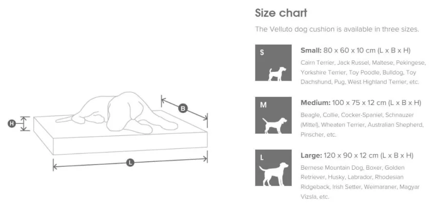 Het Velluto hondenkussen small van MiaCara heeft een lengte van 80 centimeter, een breedte van 60 centimeter en een hoogte van 10 centimeter. Dit hondenkussen heeft een afneembare en wasbare hoes die voor 60% uit katoen en voor 40% uit polyester bestaat. Deze hoes mag op 40 graden Celsius in de wasmachine gewassen of gestoomd worden. Na het reinigen dient de hoes aan de lucht gedroogd te worden. De hoes mag niet gestreken worden. Het kussen heeft een binnen kussen van katoen en is gevuld met stabiel, duurzaam en hypoallergeen polyurethaan. Het binnen kussen mag met een mild wasmiddel tot 60 graden Celsius in de wasmachine gewassen worden. Na het reinigen dient het kussen goed gecentrifugeerd en daarna aan de lucht gedroogd worden. Het mis mogelijk het binnen kussen tot een temperatuur van 60 graden Celsius in de droogtrommel te drogen. Let hierbij wel op dat het niet te droog wordt. Dit hondenkussen is geschikt voor Jack Russels, Maltezers, Yorkshire Terriërs, Buldoggen, Dashonden, Mopshonden, Poedels en andere kleine hondenrassen. Het Velluto hondenkussen small van MiaCara is in verschillende kleuren en formaten verkrijgbaar.