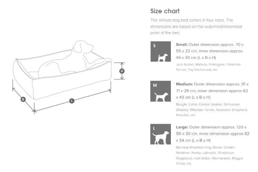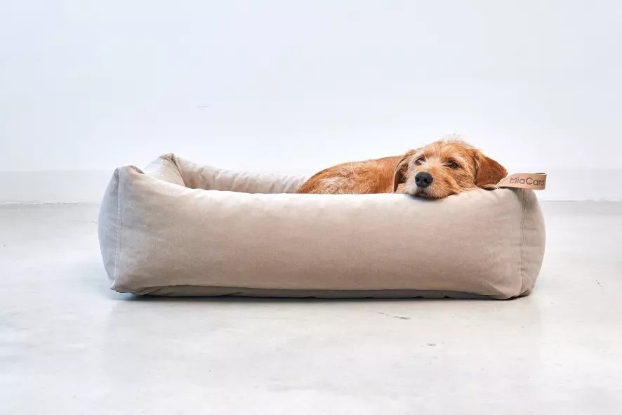 De Velluto hondenmand medium van MiaCara heeft een lengte van 91 centimeter, een breedte van 71 centimeter en een hoogte van 26 centimeter. Deze hondenmand heeft een afneembare en wasbare hoes van polyester die tot een temperatuur van 40 graden Celsius in de wasmachine gewassen mag worden. Gebruik hiervoor bij voorkeur een mild wasmiddel. De hoes dient na het wassen aan de lucht gedroogd te worden. Het binnen kussen heeft een hoes die voor 60% uit katoen en voor 40% uit polyester bestaat. Deze hoes mag in de wasmachine tot een temperatuur van maximaal 60 graden Celsius, met de fijne was, gewassen worden. Ook hier dien je een mild wasmiddel te gebruiken. Centrifugeer de hoes goed en laat deze aan de lucht drogen. De vulling van de hondenmand is gemaakt van stabiel, duurzaam, hypoallergeen en elastisch polyurethaanschuim dat op een temperatuur van 30 graden Celsius, met de fijne was, in de wasmachine gewassen mag worden. Centrifugeer het goed en laat deze aan de lucht drogen. Het is mogelijk om de binnen hoes en het matras in de droogtrommel te laten drogen maar let hierbij op dat de temperatuur niet boven de 60 graden Celsius uitkomt. Dit hondenkussen is geschikt voor Beagles, Collies, Cocker Spaniels, Ierse Setters, Schnauzers, en andere middelgrote hondenrassen. De Velluto hondenmand medium van MiaCara is in verschillende kleuren en formaten verkrijgbaar.