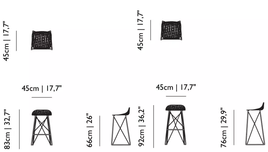 De Moooi Carbon barkruk 76cm is 45 centimeter breed, 45 centimeter diep en 92 centimeter hoog. De zithoogte is 76 centimeter hoog. De kruk is gemaakt van epoxyhars en koolstofvezels, oftewel: carbon fibres. De kleur van de barkruk is zwart. Het is wel een aanrader om de kruk regelmatig af te stoffen aangezien er stof kan blijven hangen tussen de vezels.