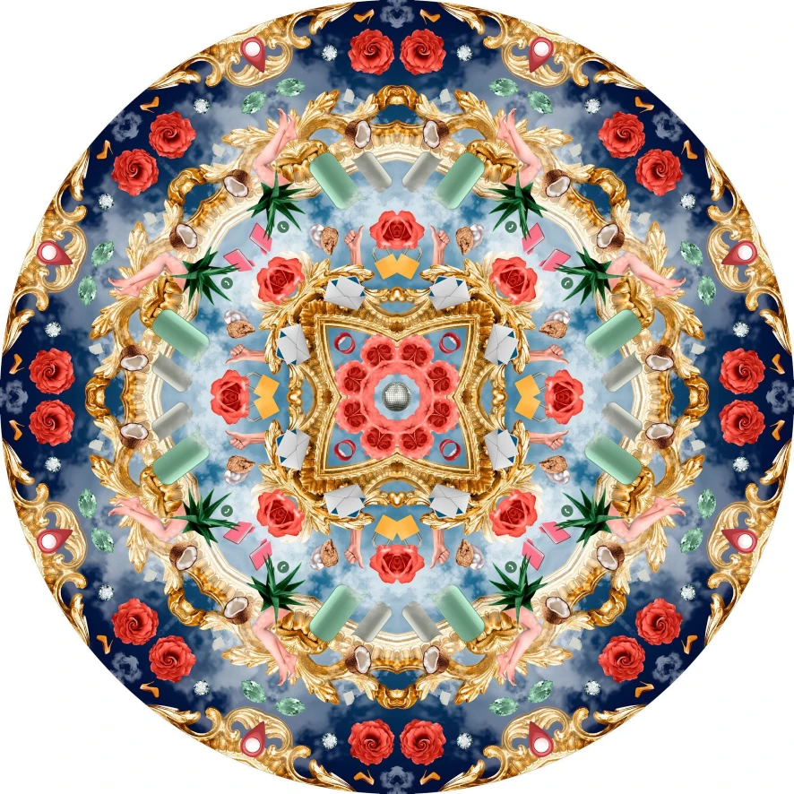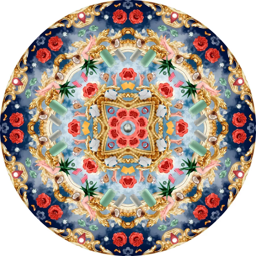 Het Utopian Fairy Tales Royal vloerkleed 350 van Moooi Carpets heeft een diameter van 350 centimeter. Het is een getuft tapijt van 100% polyamide en het valt in de gebruiksklasse CL33, wat betekent dat het geschikt is voor zwaar contact en geluid goed absorbeert. Het design van het vloerkleed is er met een chromojet digitaal op geprint. De achterkant van het tapijt is gemaakt van vilt.