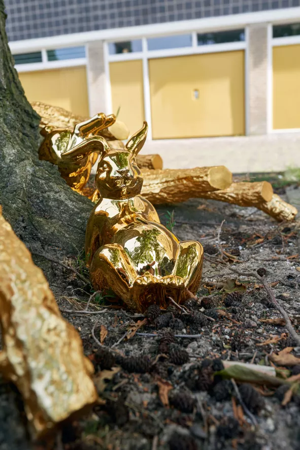 De Bunny Belly spaarpot van Pols Potten is gemaakt van porselein, en heeft een gouden afwerking gekregen. De spaarpot is 21 centimeter lang, 16 centimeter diep en 22 centimeter hoog. Hij weegt 1 kilo. De gleuf bevindt zich op de buik van het konijn.