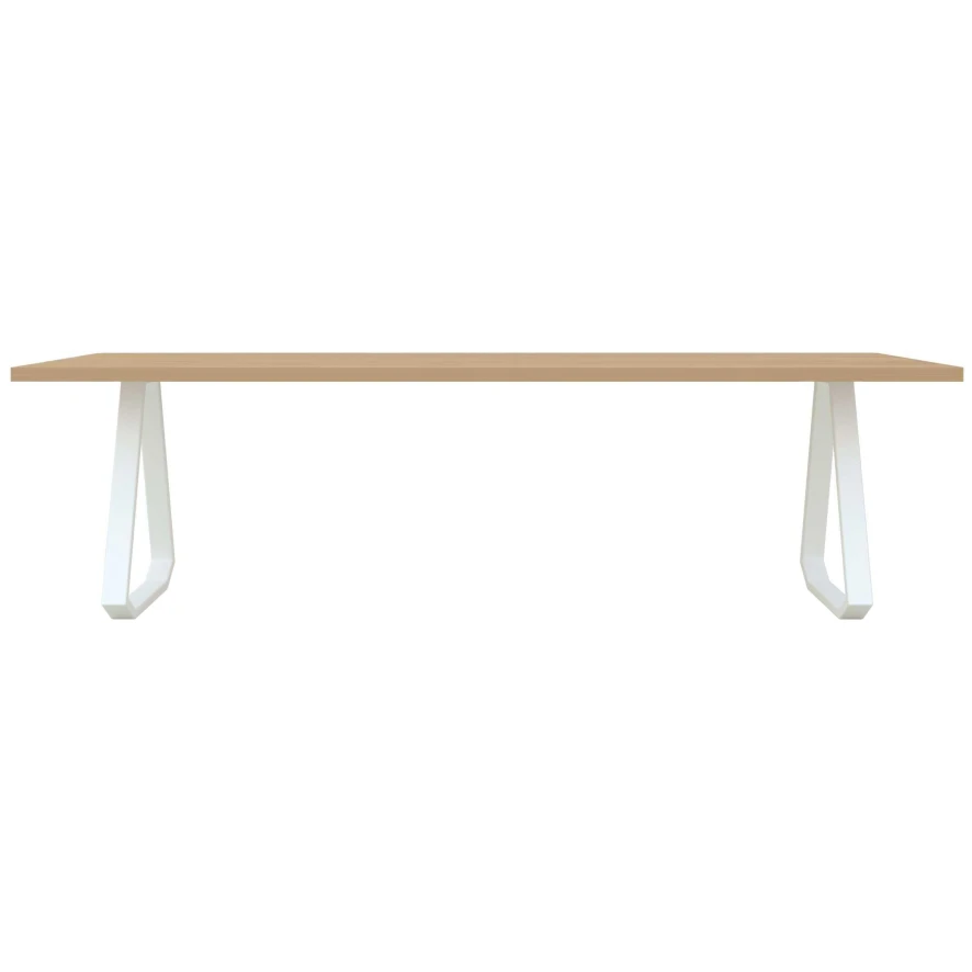 De Topple Tafel 240×90 van Studio HENK heeft een lengte van 240 centimeter, een breedte van 90 centimeter en een hoogte van 74 centimeter. Je kunt voor het stalen frame kiezen uit een witte of een zwarte poedercoating. Voor het tafelblad van eikenhout kan je kiezen uit een variant die behandeld is met hardwax naturel of een die behandeld is met een twee-componenten lak. De Topple tafel is ook in andere afmetingen verkrijgbaar.