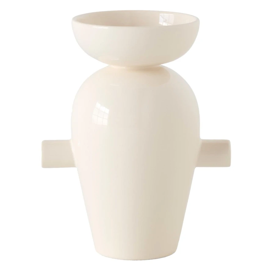 De vaas heeft een lengte 19,3 centimeter, een breedte van 15,2 centimeter en een hoogte van 28,8 centimeter. De vaas is gemaakt van keramiek en heeft een crèmekleurige afwerking.