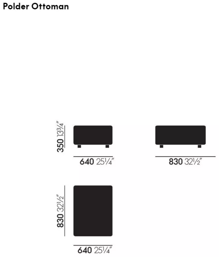 De Polder Ottoman Poef van Vitra heeft een breedte van 64 centimeter, een diepte van 83 centimeter en een hoogte van 35 centimeter. De poef heeft een houten frame en heeft een vulling van polyurethaanschuim. De poef is verkrijgbaar in verschillende stoffen en kleuren.