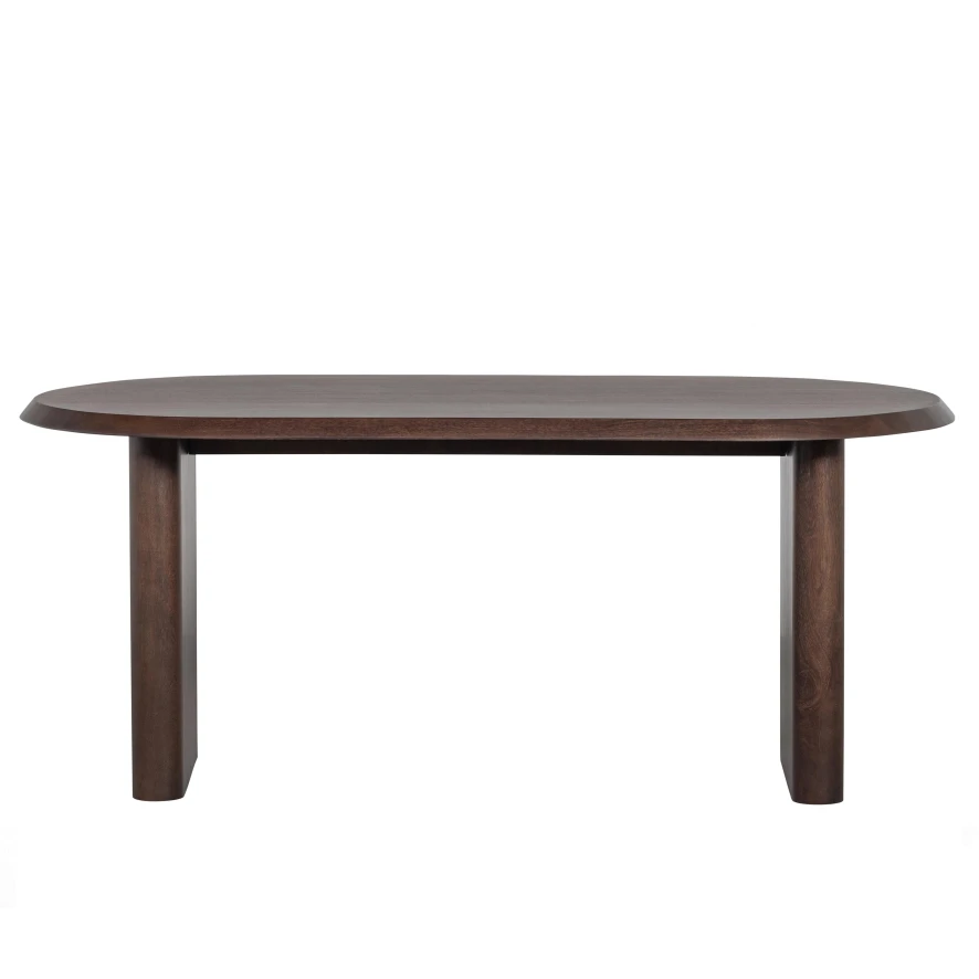 De Ellips eettafel 90×180 van vtwonen is 180 centimeter lang, 90 centimeter breed en 75 centimeter hoog. De tafel heeft een bladdikte van 4 centimeter, een pootbreedte van 55 centimeter, een pootdiepte van 10 centimeter en een poothoogte van 71 centimeter. De eettafel weegt 73 kilogram en heeft een draaggewicht van 150 kilogram. De eetkamertafel is gemaakt van behandeld mangohout met een walnootkleurige afwerking.